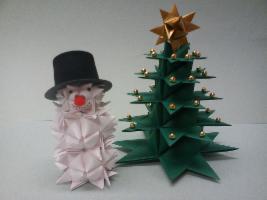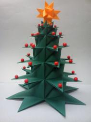 Für einen Baum von ca 30 cm Höhe benötigen sie 4 Bogen Tonpapier 50 x 70 cm. Schneiden sie hierzu je 8 Streifen à 70 cm Länge in 7, 6, 5 und 4 cm und kleben sie je 2 Stück zusammen damit sie 4 Streifen von 140 cm erhalten. Dann schneiden sie noch je 4 Steifen in 3 und 2 cm Breite. Nun falten sie sie normale Fröbelsterne, wobei bei dem breitesten nur auf einer Seite Zacken ausgeformt werden. Diese kleben sie nach obiger Abbildung übereinander. Für die Spitze können sie einen weiteren Stern mit 2 cm breiten Streifen falten. Danach können Sie den Baum nach belieben verzieren. Es geht auch etwas kleiner: mit 3,5 - 3 -2,5 -2 - 1,5 cm breiten Streifen.